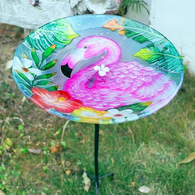 MUMTOP Bird Baths for Outdoors, Glass Bird Bath Stake, Flamingo Birdbaths & Support, Bee Baths for Garden, Outside, Lawn, Outdoor Decor