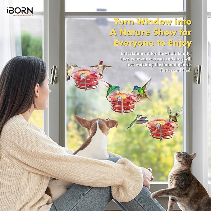 - 【Hang at Any Height, Flexible Arrange Window Hummingbird Feeder】iBorn window hummingbird feeders give you the ultimate flexibility to create your ideal birdwatching experience. Mount at any height on your window, whether eye-level at your kitchen sink, slightly higher for sofa viewing, or lower for children or pet to enjoy. The ultra-strong suction cups hold securely on glass while allowing easy adjustment to find that sweet spot where you get the clearest views of visiting hummingbirds.