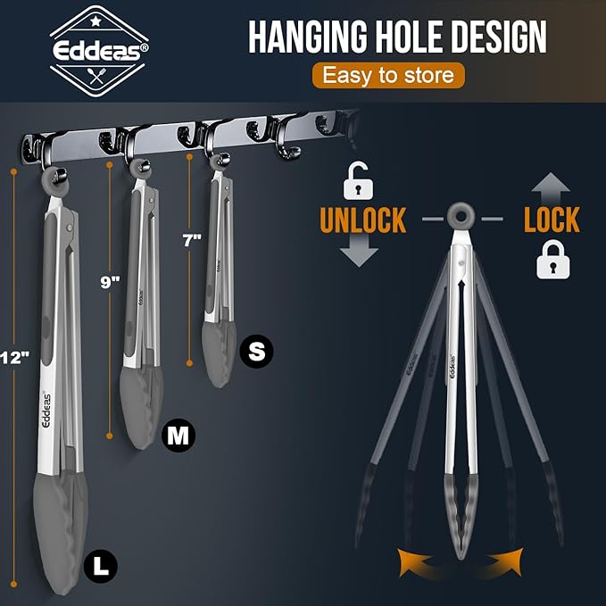 - LOCKING MECHANISM & PULL-RING TECHNOLOGY - Eddeas ring-pull technology will keep your tongs from opening and closing accidentally which will allow you to facilitate better control while using them. And can be conveniently dried and stored. the tongs easily become compact when you pull the easy pull lock up, they fit seamlessly in most drawers and cabinets for easy storage; also include a hook for easy hang