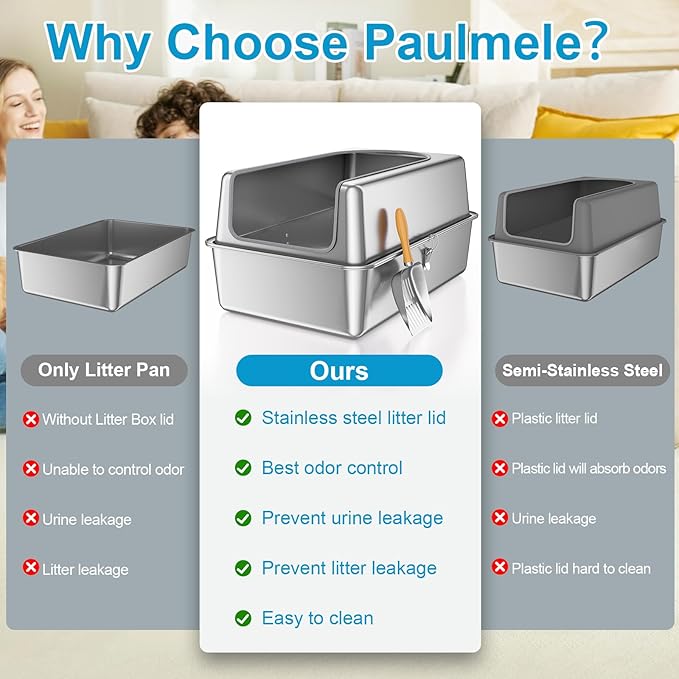 - Why Choose Paulmele: We replaced the plastic lids on the market with stainless steel to solve the problem that plastic lids still absorb odors and are difficult to clean. The all stainless steel cat litter box is easy to clean, does not absorb odors, is sturdy and durable, can brings great convenience to your life