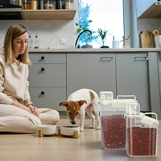 Dog Food Storage Container, Upgraded Large Nozzle BPA-free, 3-5 LBS Plastic Pet Food Storage Containers, With 4 Sealed Clasps, 1 Measuring Cup and Handle (Beige-A)
