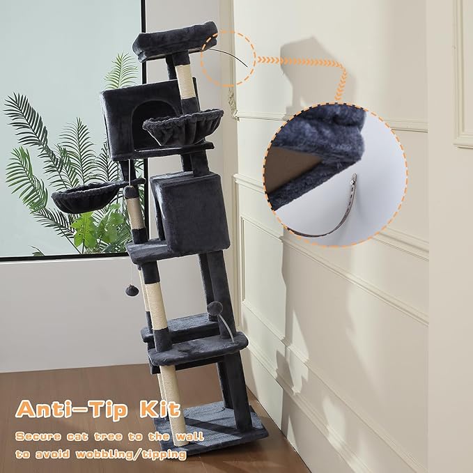70-Inch Cat Tree,Large Cat Tree Tower with Hammock, Scratching Post, Condo and Multi-Level Cat Tower for Large Cats, Cat Activity Center Playhouse, Dark Gray LCT016