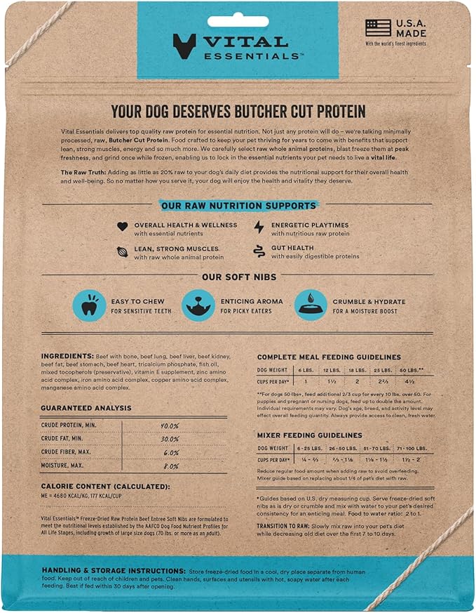 - SOFT NIBS FREEZE-DRIED RAW BEEF DOG FOOD: Vital Essentials Freeze Dried Soft Nibs Dog Food packs more protein than industry standard into every soft bite to deliver the peak vitality your dog deserves, especially when compared to dehydrated dog food. This complete and balanced freeze-dried raw dog food is made with premium Butcher Cut beef, responsibly sourced in the USA.