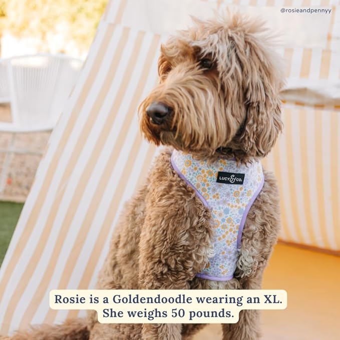 Lucy & Co. Cute Reversible Dog Harness Walking Halter - Best Designer Pet Harnesses for XS - XL Dogs - Padded Adjustable Vest for Easy Walking (Large, Among The Wildflowers - Purple Floral)
