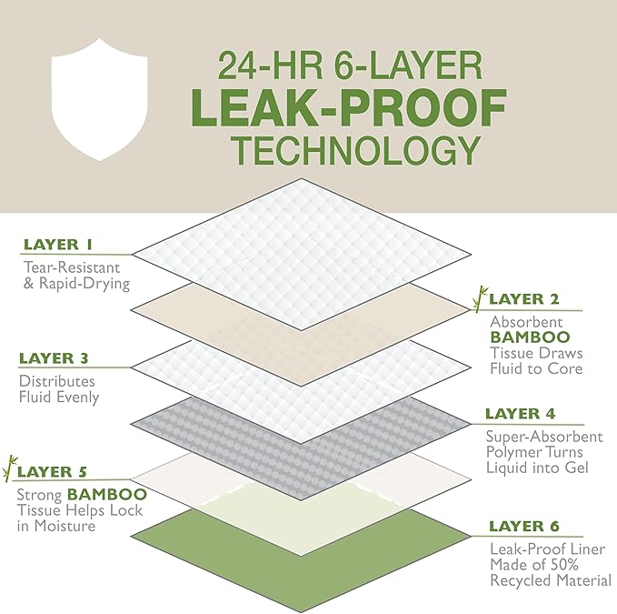 - Earth-Friendly Materials - Features bleach free, dye free layers and a leak proof liner made of 50% recycled materials