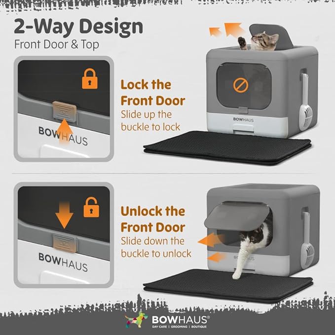 - Dual Entry with Lockable Front Door: Our cat box has two entry points for easy access, allowing your kitten to enter from either side; the lockable front door keeps litter in, reducing mess and ensuring waste stays inside for a cleaner environment
