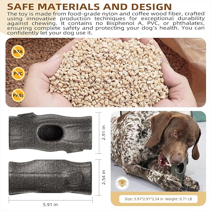 - Safe design and materials:The dog chew toys for aggressive chewers are made of food grade nylon and coffee wood fiber, using innovative production techniques to ensure safety and health. It is highly chew-resistant for tough dog toys for aggressive chewers and free of bisphenoI A, PVC and phthalates to fully protect your dog's health. So you can trust your dog to use it.