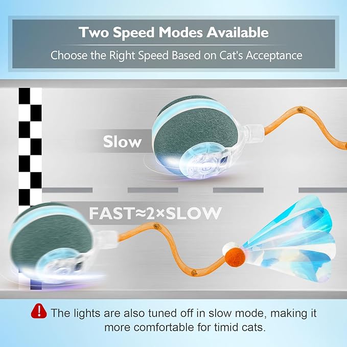 - 【Multi-Surface Performance】The enhanced motor system allows this interactive cat toy to navigate effortlessly across thick carpets, thin rugs, and hardwood floors (note: slight speed reduction on carpeted surfaces). If decreased mobility occurs, follow included instructions to remove hair from mechanical parts for optimal performance restoration