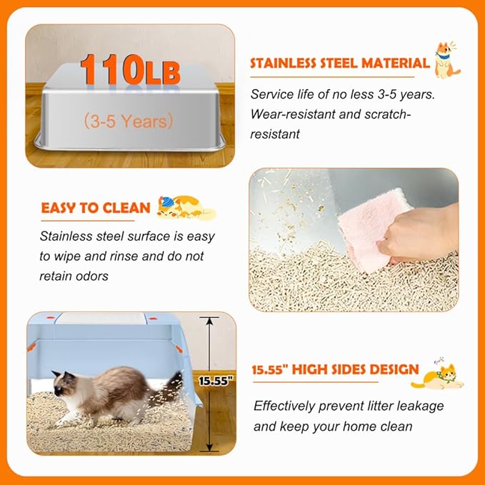 - PREMIUM STAINLESS STEEL - Built with thickened stainless steel, this cat litter box is rust-resistant, scratch-proof, durable and long-lasting. It helps reduce odors more effectively than plastic alternativess, keeping the space fresh. The box holds up to 110 lbs and lasts 3-5 years, reducing the need for frequent replacements