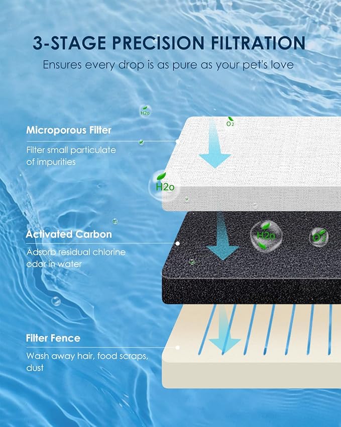 - 【Multi-layer Filtration】This cat water dispenser dispenser includes 1 filter with a 3-layered filtration system (1)Microfiltration Cotton: Trapping even the tiniest impurities (2)Activated Carbon: Eliminating odors (3)Filter Barrier: Hindering pet hair. It provides pets with pure and healthy drinking water
