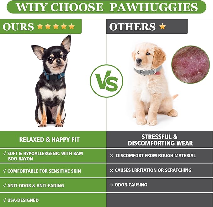 - HAPPY & COMFORTABLE WEAR FOR SENSITIVE DOGS: Made from bamboo-rayon, a naturally hypoallergenic material, Pawhuggies dog collars keeps your dog relaxed and happy, free from scratching or discomfort. Ideal for sensitive skin, it provides gentle, irritation-free comfort. Unlike traditional collars that cause discomfort or trap unpleasant odors, this collar stays fresh with anti-odor and anti-fading properties, maintaining its softness and appearance with everyday use