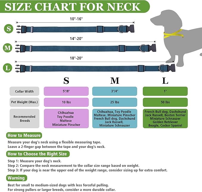 - QUICK-RELEASE BUCKLE WITH TIGHT SECURE: Effortless Adjustment for Playful Pups! No more slipping or constant adjustments—collar stays snug and secure. Whether your dog’s playful or active, the adjustable design ensures comfort. The quick-release buckle keeps it tight but opens easily when needed. Important: Incorrect sizing may cause the collar to loosen. Ideal for small to medium dogs, but not for heavy chewers or intense pullers—buckle may slip and material may not withstand excessive force