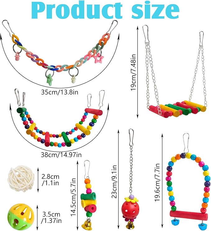 - 17Pcs Bird Toy Set: The bird cage toy set includes 6 parrot toys and 1 wooden perch platform, 5 bird foot ball toys, 5 rattan balls, equipped with ladder and swing, to meet your bird climbing, chewing, standing, playing and rest needs, so that your bird gets a good exercise