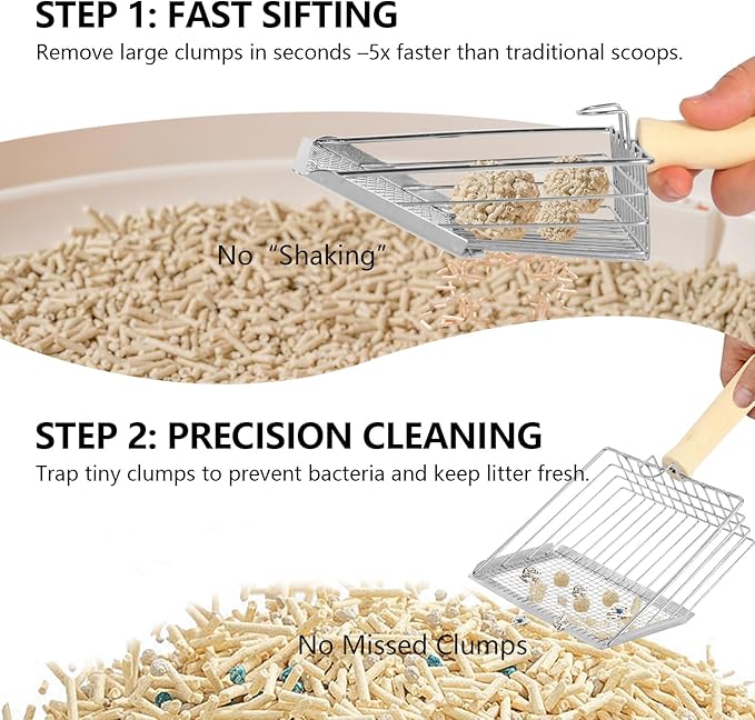 - ★ Comfortable & Ergonomic Design – The upgraded handle is now extra sturdy and won’t loosen over time. Made from solid wood and shaped for a natural grip, this stainless steel cat litter scoop follows ergonomic principles to reduce hand strain, making scooping easier and more comfortable