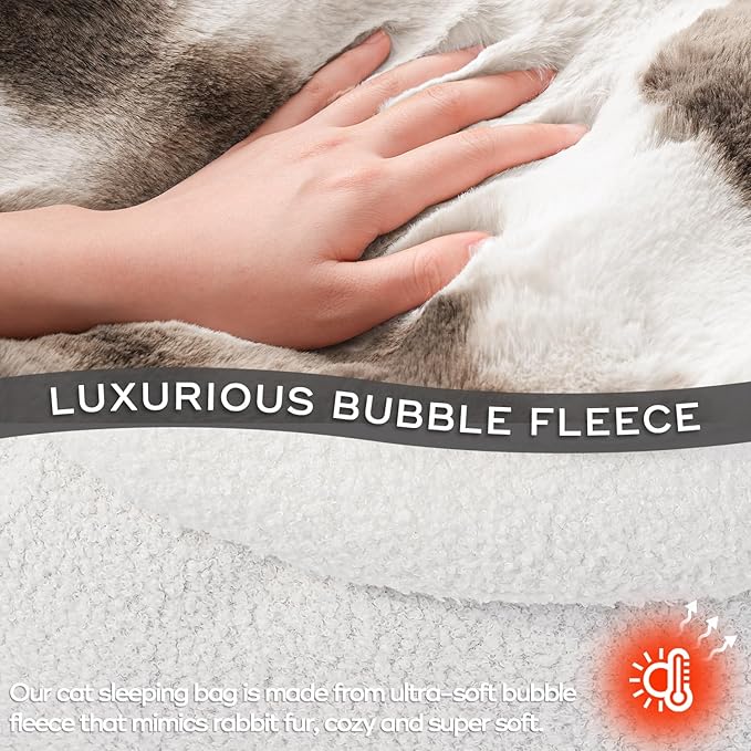 - LUXURIOUS PLUSH MATERIAL. Cat bed is made from ultra-soft plush fabric, this sleeping bag ensures your cat or puppy stays comfortable and snug all season long.