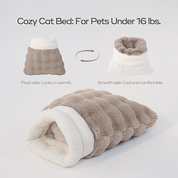 - LUXURIOUS PLUSH MATERIAL. Cat bed is made from ultra-soft plush fabric, this sleeping bag ensures your cat or puppy stays comfortable and snug all season long.