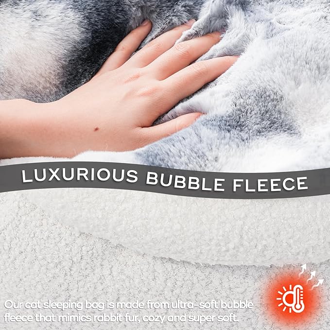 - LUXURIOUS PLUSH MATERIAL. Cat bed is made from ultra-soft plush fabric, this sleeping bag ensures your cat or puppy stays comfortable and snug all season long.
