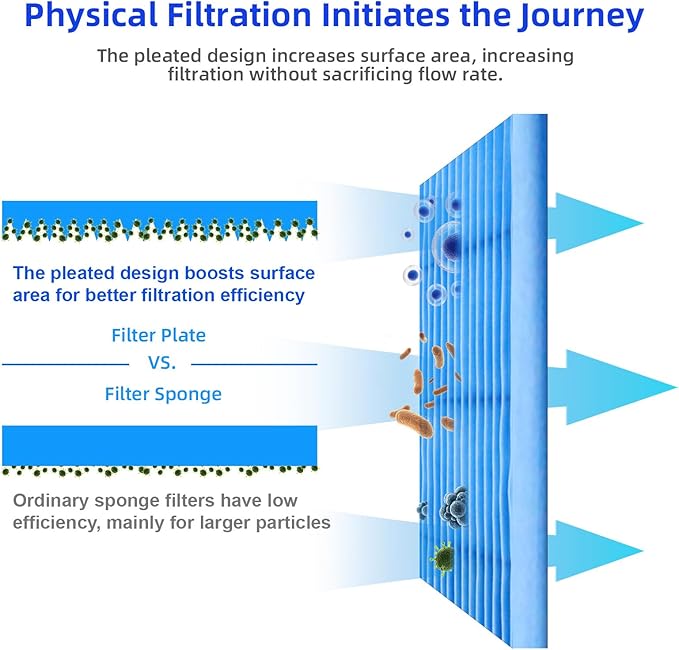 - DOUBLE FILTRATION:The spacer filters out hair, dander, dust and tiny particles, and the 254nm light treats the green water. Keep your fish tank crystal clear.