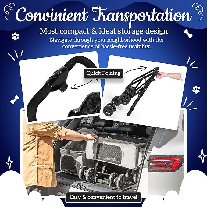- 【PORTABLE & FOLDABLE】The compact travel stroller is portable to carry anywhere and effortlessly foldable with the press button for easy storage in trunk or car when not in use saving valuable space. The double pet stroller comes in single and double detachable storage baskets. The collapsible design offers convenient travelling and camping with easy cleaning. This foldable stroller is a breeze to assemble, stroll and fold.