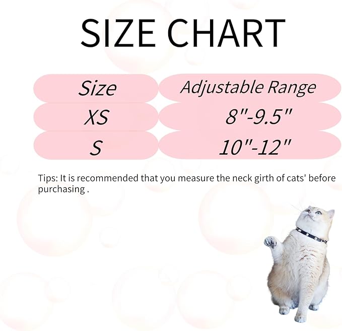 - SIZE ADJUSTABLE - First of all, it is recommended that you measure the neck girth of cats' before purchasing. Size XS is best for cats whose neck girth is among 8 inches to 9.5 inches, and size S is for cats whose neck girth among 10 inches to 12 inches