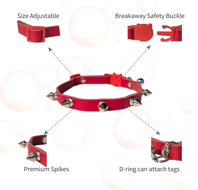Spiked Cat Collar with Bells, Breakaway Genuine Leather Protective Collar for Kitty, Studs Spikes Punk Style Adjustable for Girl Boy Kittens Small Bunny Rabbit, 10"-12" Red