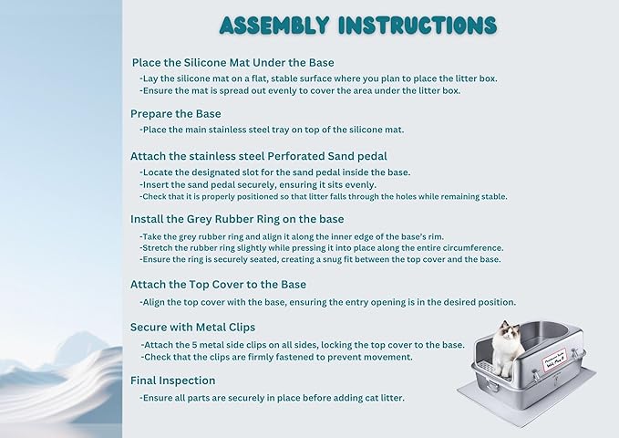 - Quiet & Stable –Unlike other stainless steel litter boxes, this stainless steel enclosed litter box features a full silicone mat underneath, absorbing noise and vibrations to reduce loud scratching sounds. The non-slip, pet-safe silicone base keeps the steel cat litter box firmly in place, ensuring stability and a peaceful experience for both you and your cat.