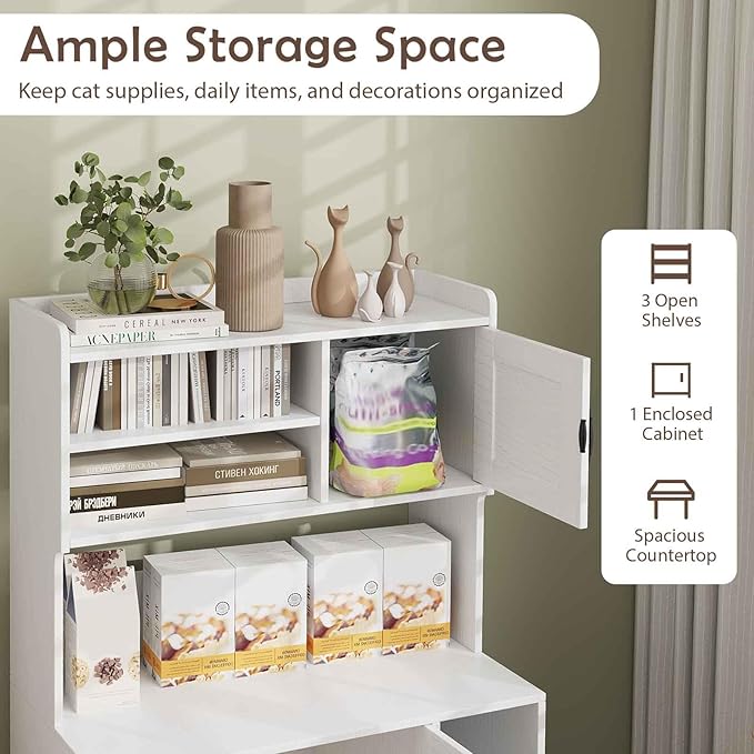- Ample Storage Space: Equipped with 3 open shelves, 1 enclosed cabinet, and a spacious countertop, this cat litter box enclosure is designed to keep cat supplies, daily items, and decorations organized. The multipurpose cabinet serves not only a practical cat litter box enclosure, but also a cozy cat house.