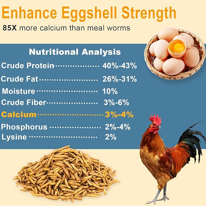 - 【Superior Chicken Feed】Natural GMO-Free BSF Larva loaded with 85X more calcium than dried mealworms, 40-43% protein, 26-31% healthy fat, 3-5% calcium, phosphorus, lysine, healthy fats, support your chicken's immune system and also provide optimal nutrition for laying.