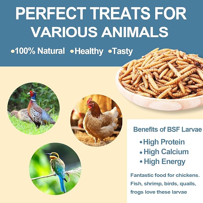 - 【Snacks Enjoyed By Your Pets】 Mix the black soldier larvae in chickens daily diet or simply scatter on the ground, chickens get activity while looking for the tasty goodies!. BSFL is also loved by Birds, Hens, Ducks, Reptiles, place your BSF Larva in some conspicuous places or feeders to attract beautiful wild birds by the scent of the grubs.