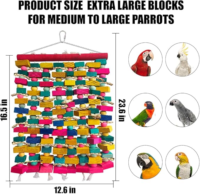 - PERFECT SIZE FOR LARGE& MEDIUM PARROT - Our parrot toys for large birds measures 23"x13" with colorful wood block, Suitable for finch, budgie, love birds, parakeets, macaw, conures and African grey, cockatoos.
