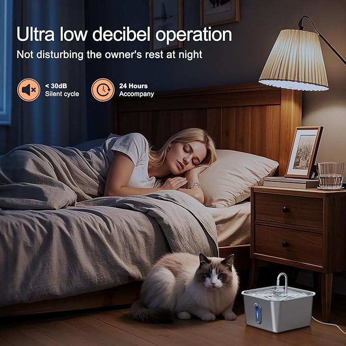 - ULTRA-QUIET ≤30 DB PUMP:The cat drinking fountain is equipped with a newly developed water pump, which has a running noise of only about 30db, which is very quiet. You don't have to worry about your pet being frightened or the noise affecting its daily habits. In addition, the energy-saving water pump is 5V low pressure, and the water output is stable and splash-free. If you encounter any problems during use, please feel free to contact us, we provide one-year after-sales service