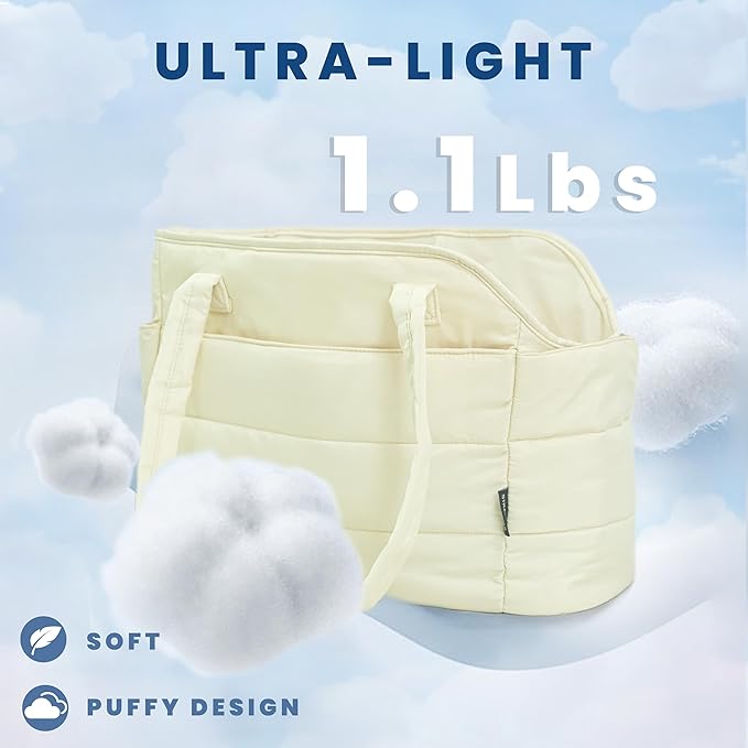 - Ultra-Light & Stylish Puffy Design: Weighing just 1.1 lbs, this chic puffy dog carrier is crafted from ultra-light materials with a fashionable quilted exterior. The removable padded hard-bottom base provides strong, stable support. Perfectly sized at 17"L x 8"W x 12"H to comfortably carry small dogs up to 15 lbs (6.8 kg)βideal for Chihuahuas, Yorkies, puppies, and other toy breeds.
