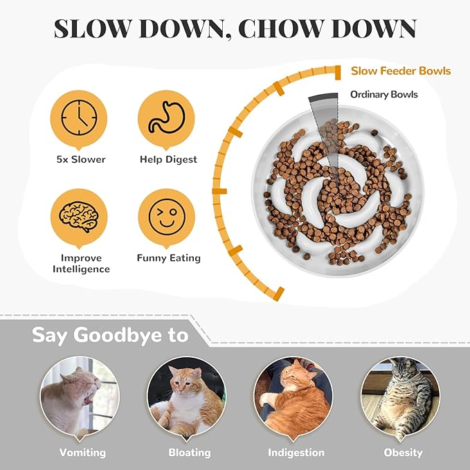 - Extra Wide Design & Non-Slip - The large 6.3-inch diameter allows your cat to easily access food without bothering their whiskers. The packaging comes with some anti-slip stickers that can be used on the bottom of the slow eating cat bowl to prevent slipping and tipping.