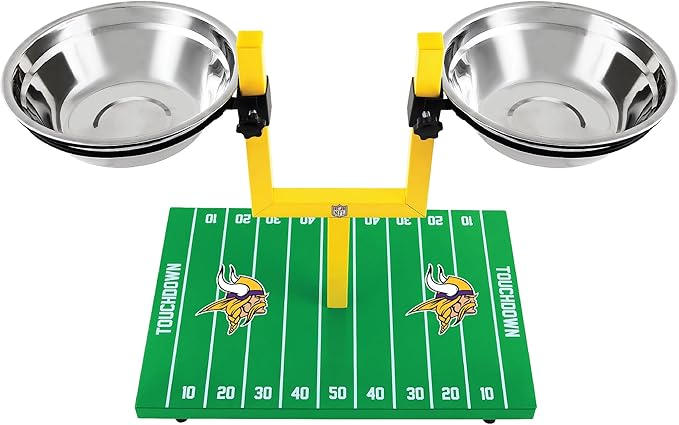 NFL Minnesota Vikings Goalpost Football Field Dog Feeder – Adjustable Elevated Dog Bowls with Stand, 2 Stainless Steel Bowls, Non-Slip Rubber Feet, Raised Pet Feeder for Large & Small Dogs, Cats.