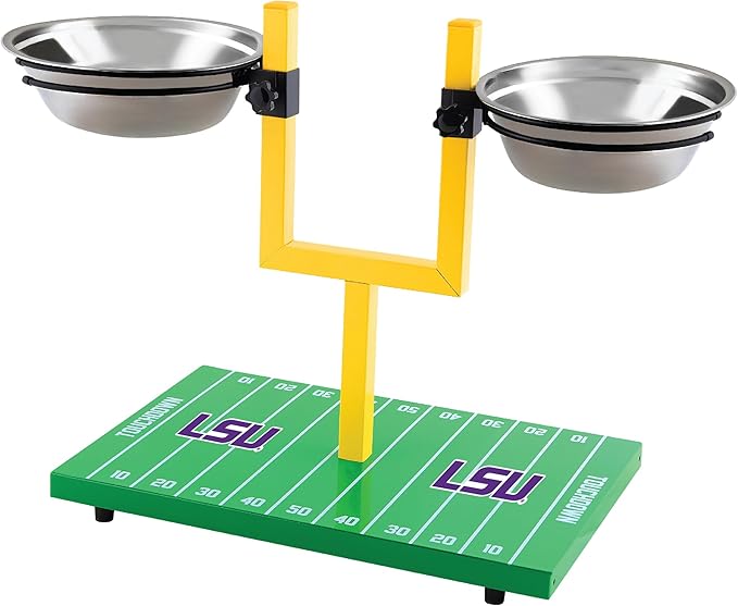 NCAA LSU Tigers Goalpost Football Field Dog Feeder – Adjustable Elevated Dog Bowls with Stand, 2 Stainless Steel Bowls, Non-Slip Rubber Feet, Raised Pet Feeder for Large & Small Dogs