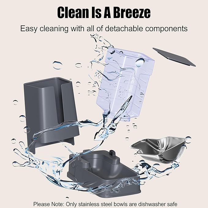 - Automatic Cat Feeder With Food Grade Stainless Steel Bowls: We upgrade the cat automatic feeders, both cat feeder and cat water dispenser equipped with detachable stainless steel bowls, It is easy to clean and diswasher safe. The PET and PP materials of the cat automatic feeders are BPA-free, resistanting to drop and pressure, and can be washed directly with cold water (can only be washed by hand). It is recommended to wash once a week