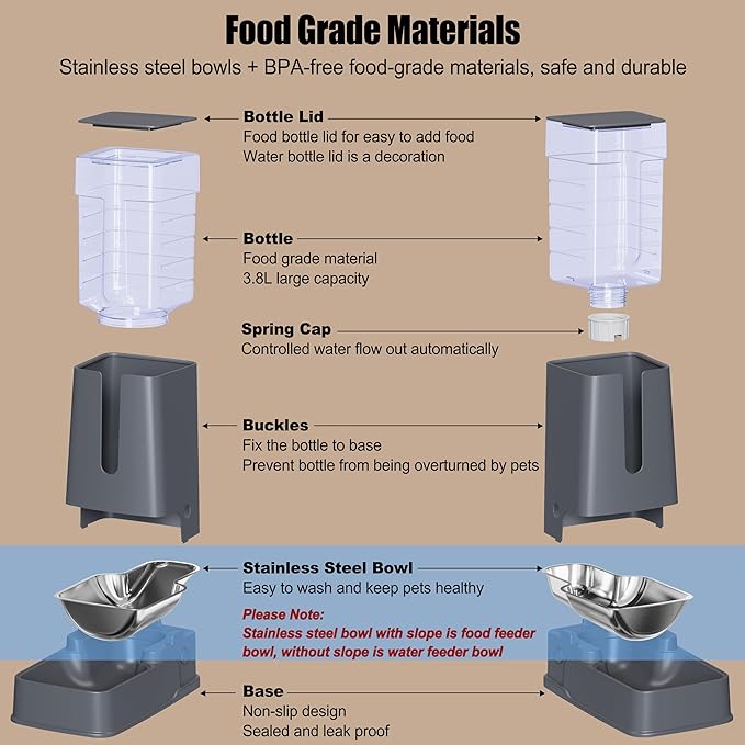 - Please Note: The stainless steel food bowl and water bowl are different, make sure they are placed in the correct position or it may cause the pet water feeder to leak. If your pet water feeder is leaking, please check if you are using the food bowl incorrectly as a water bowl, and switching back to the correct water bowl will solve the problem