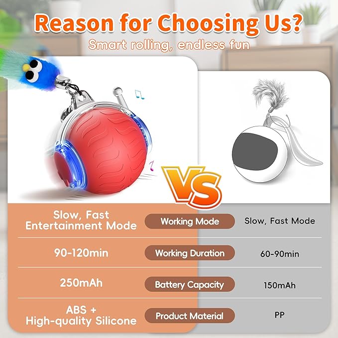 • Play on Any Floor: The powerful motor in this interactive cat ball toy ensures smooth rolling on thick carpets, thin carpets, wood floors & tiles, which avoids game interruptions caused by lag and allows your pet to always enjoy the fun of hunting
