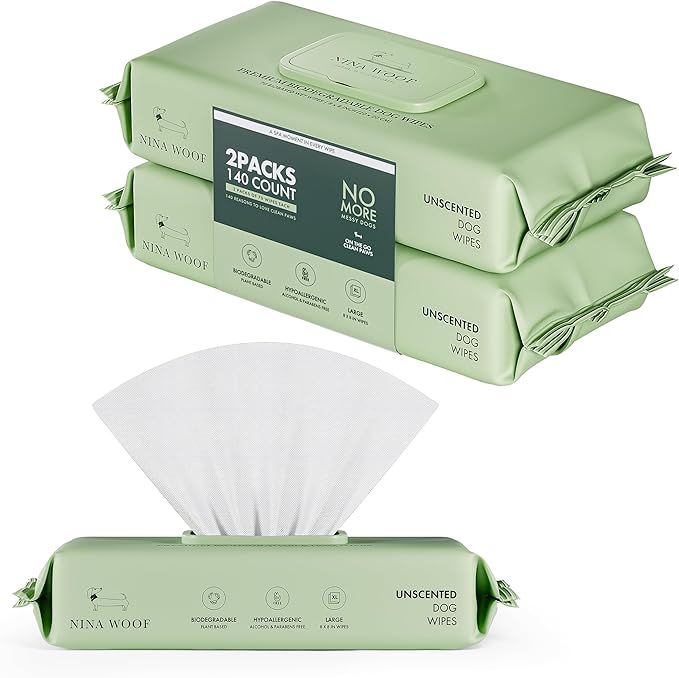 Nina Woof Dog Wipes – Fragrance-Free, Alcohol-Free, Hypoallergenic Pet Grooming Wipes with Aloe Vera, Biodegradable, for Dogs & Cats: Paws, Face, Ears & Butt – 2-Pack (140 Count)