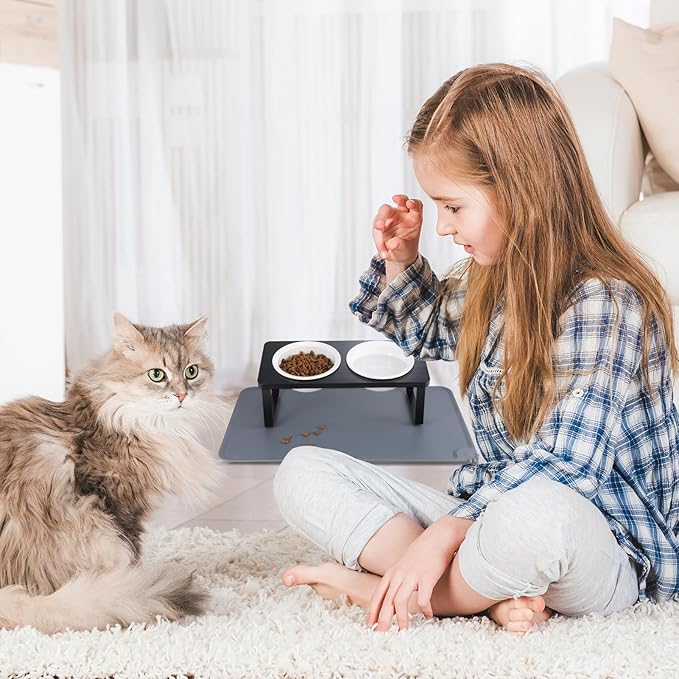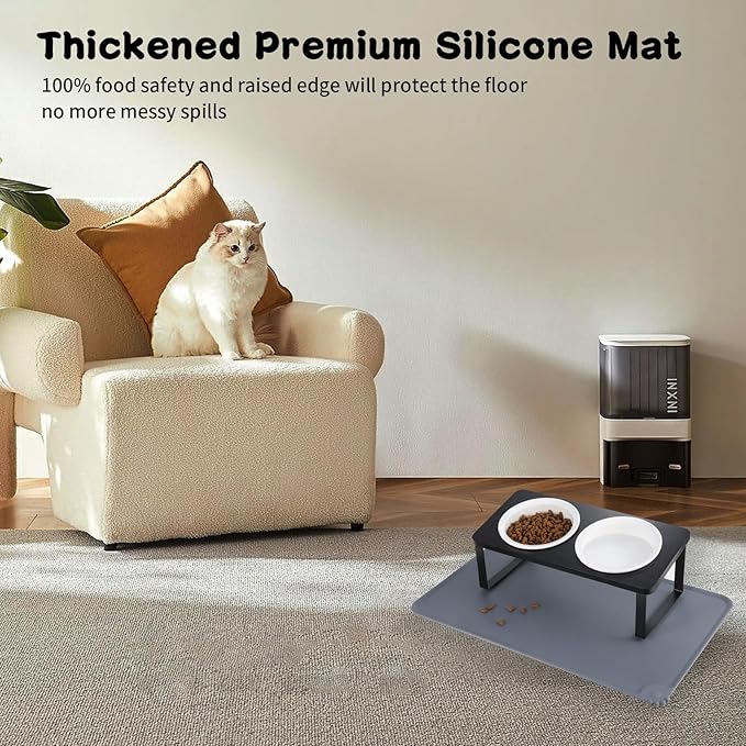 - 【Silicone Food Mat】Pet feeding bowl with silicone bowl mat can prevent cats and puppies from spilling food residue on the floor while feeding, keep the room or carpet clean and hygienic. Thickened silicone material, no need to worry about cat licking, food safety.Great Value Matching, Mat Size:18.9*11.8 inches.