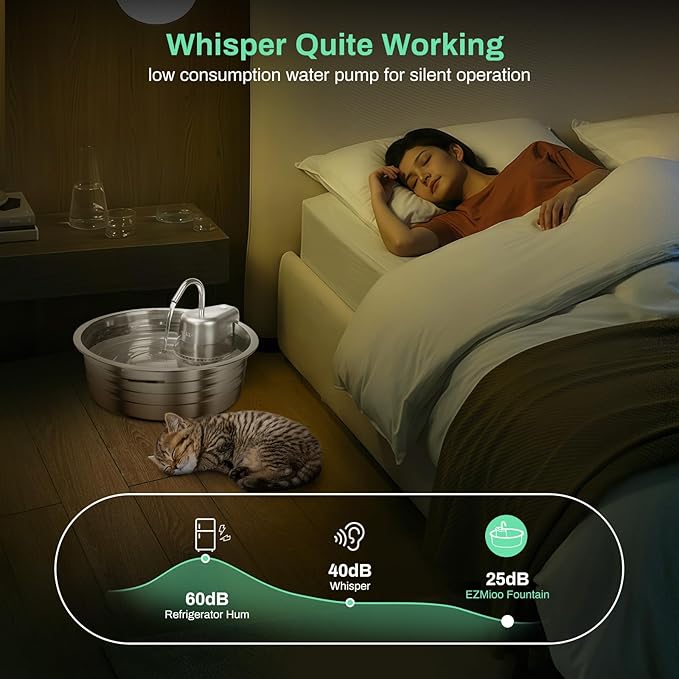 - đ˝ăULTRA-SILENT PUMP & LOW CONSUPTIONă: The fountain pump is ultra silent when running, keep it below 25db, only the sound of water flow can be heard. Even if it runs at night, it will not affect you and your petâs sleep