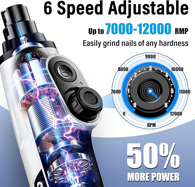 - 【Adjustable 6 Speeds for Perfect Precision】 With speeds from 7000 to 12000 RPM, the Casfuy electric dog nail file is one of the most powerful on the market. It offers 6 speed levels, each featuring 9 variable power settings. The smart optimization ensures that every speed delivers the ideal power for small, medium, and large pets’ nail care. Experience the perfect blend of power and precision.