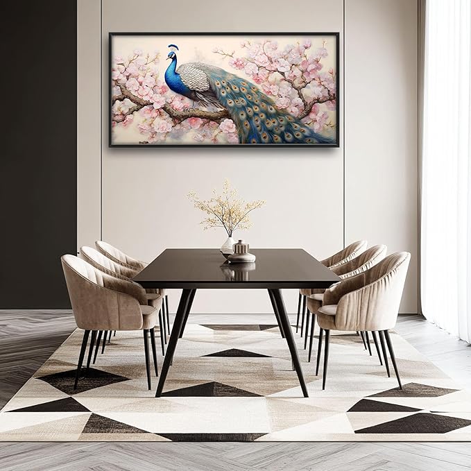 - 【Unique Design】A blue peacock with a long tail perched on the branch of a cherry blossom tree. The delicate brushstrokes capture the pink and white flowers in full bloom, with soft lighting and elegant colors. The intricate details of the peacock's highly detailed feathers are rendered with precision in this high-resolution work.