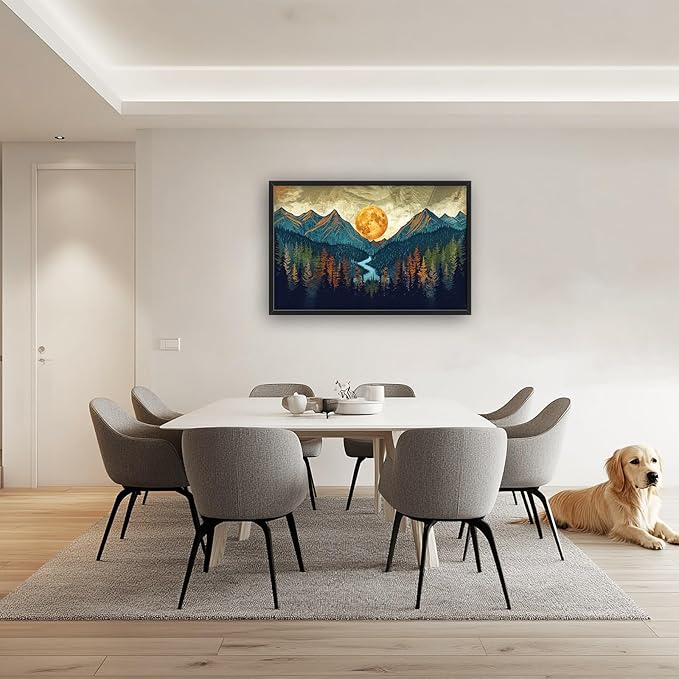 - 【Unique Design】An artwork of mountains and forests with the moon rising between them. Use muted earth tones, a forest green color for the trees, and a deep blue to depict the water flowing through the valley. The sky should have shades of grey or brown, with golden hues from the sunset casting on the mountain peaks. In the center is a large, orange sun shining over everything.