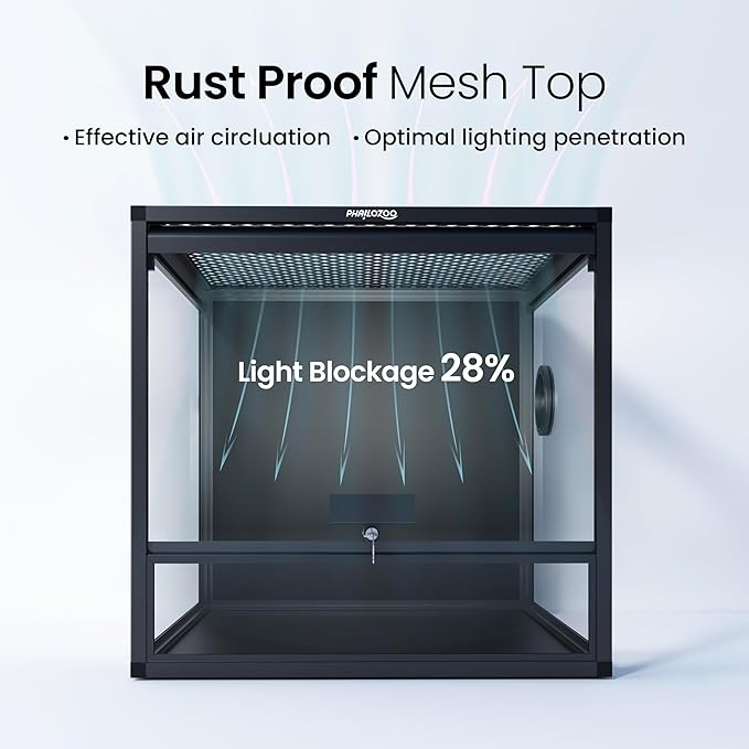 - 【Perfect for Beginners】Phailozoo 24-gallon reptile tank with single grommet measures 18'Lx18''Wx18''H. It only weighs 16.5 pounds. Easily assembled in six steps, perfect for first time reptile keepers.