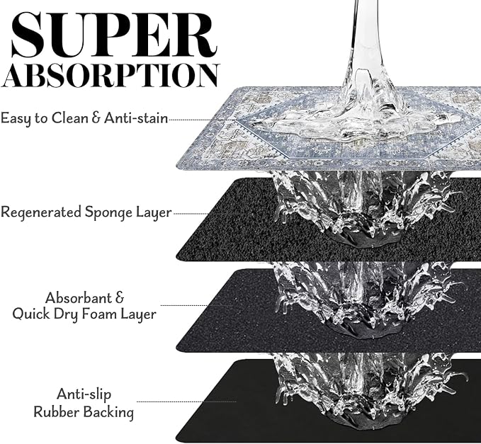 - Super Absorption: The dog mat for water bowl can absorb spilled water without leaving traces and dry quick, avoid wetting pet paws even for messy drinkers. And it does not attract pet hair like traditional silicone dog bowl mat.