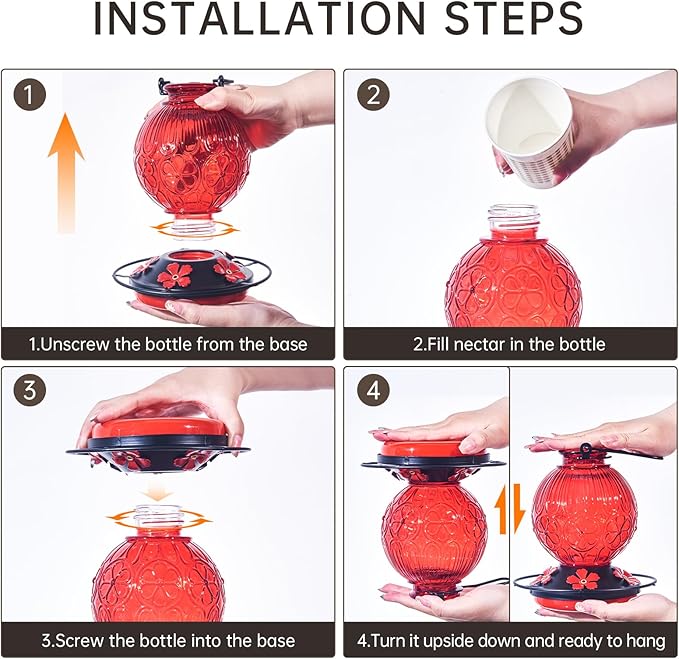 - ❤【Easy Refilling and Cleaning】: The wide-mouth jar allows for convenient refilling with your preferred hummingbird nectar solution. Clear bottle is also could be disassembled easily for easy cleaning