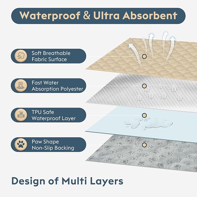 - ✔️ 【Leakproof & Anti-Slip】 Our pee pads ensure both your pet's safety and your peace of mind. With a strong waterproof TPU inner layer, leaks are prevented, protecting your floor. The upgraded non-slip backing keeps the liners secure, providing stability for your pet and minimizing accidents.