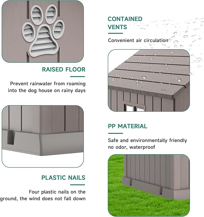 - VENTILATED AND THERMOSTATIC DOGHOUSE: The integrated ventilation system in the outdoor dog house roof section aids in the flow of fresh air and with a window design, the innovative heat balance feature protects your pet in cold weather and keeps them cool in hot conditions.
