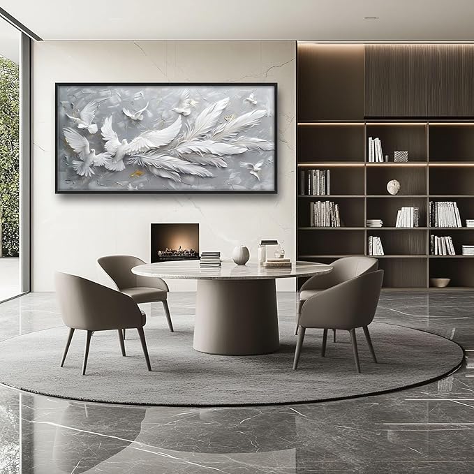 - 【Unique Design】3D abstract painting of white doves with long feathers, flying in the air. The background is gray and textured. There should be no shadows on it. In front, there will also be other light-colored birds, and they can have different shapes. Together, they form an artistic composition that symbolizes peace or freedom. White feathers on wings, full-length, high detail.